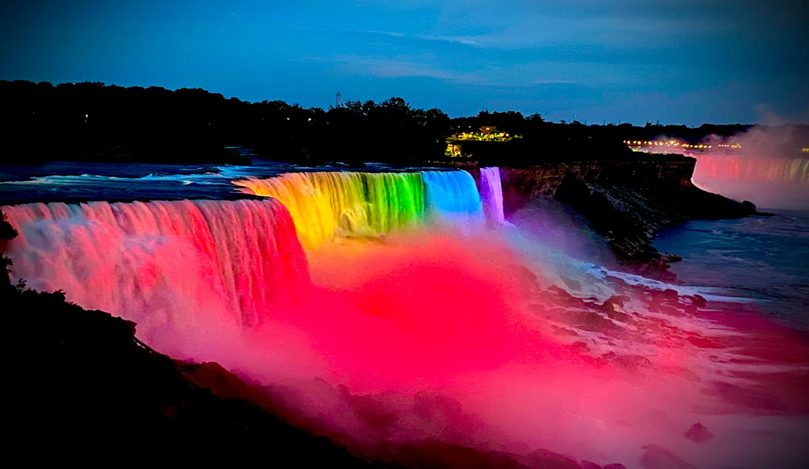 The Falls are beautifully illuminated in a range of vibrant colors, creating a breathtaking scene that feels like something out of a dream. The reflections on the mist and water make for a stunning visual spectacle, making it a perfect way to end your day.